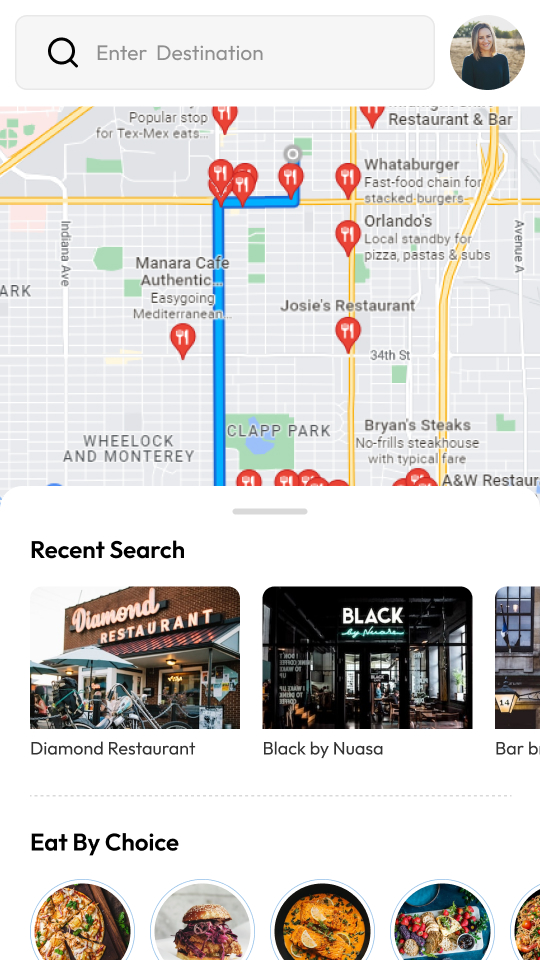Our app displays good-rated restaurants along your route, making it easy to find quality food options while traveling.